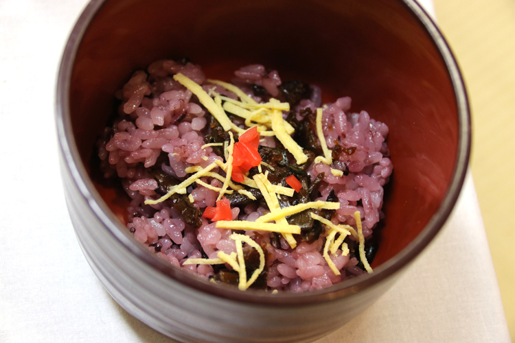 ▼締めの一品は、紫米の酢飯に、ゼンマイ、シイタケ、鬼グルミなどをのせた素朴な”山里のすし”と”大きななめこ汁”♪