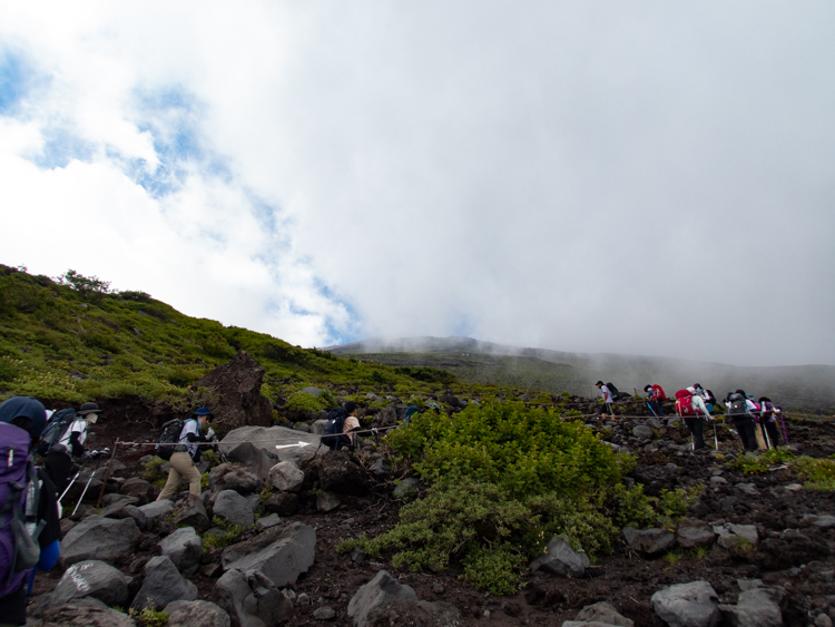 ▼五合目までは小雨が降っていましたが、登り始める頃には止んでいました。蜜を避けるため、4グループに分けて登山を開始します。
