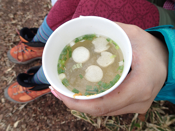 ▼添乗員の玉木さんとガイドの平川さんが皆さんにお味噌汁をふるまってくれました。小雨も降る中でしたのでほっこり温まりました。