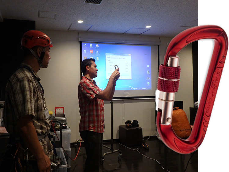 ▼体験会の際にも使用していただく、カラビナの基本の使い方も教えていただきました。